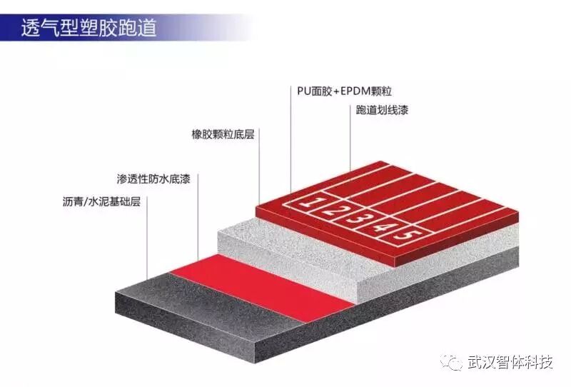 透气型塑胶跑道材料是由橡胶环保颗粒为底层,聚氨酯颗粒与塑胶浆为面层铺设组成的高性能塑胶结构。具有使用寿命长、综合性能适中、施工快捷等优点,它最经济、价格最低廉,而且不会有鼓泡现象发生,同时也减少了地基经费的投入。