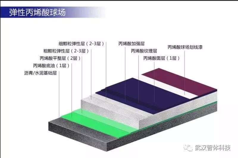 丙烯酸运动场地系列,包括硬地丙烯酸和弹性丙烯酸两个系统。硬地丙烯酸面层(硬地球场面层厚度1.5mm-2mm,可适用于沥青基层或高质量的混凝土基层);弹性丙烯酸面层(弹性球场面层厚度3.0mm-8mm,可适用于沥青基层或高质量的混凝土基层)。
